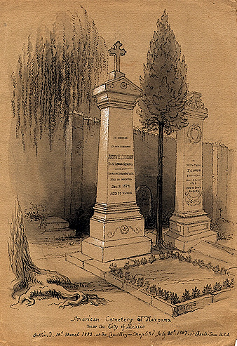 - American Cemetery at Traxpama near the city of Mexico outlined. March 18, 1883. at the cemetery....completed July 30, 1887. at Charlestown U.S.A. (en versa-Greek architecture)
