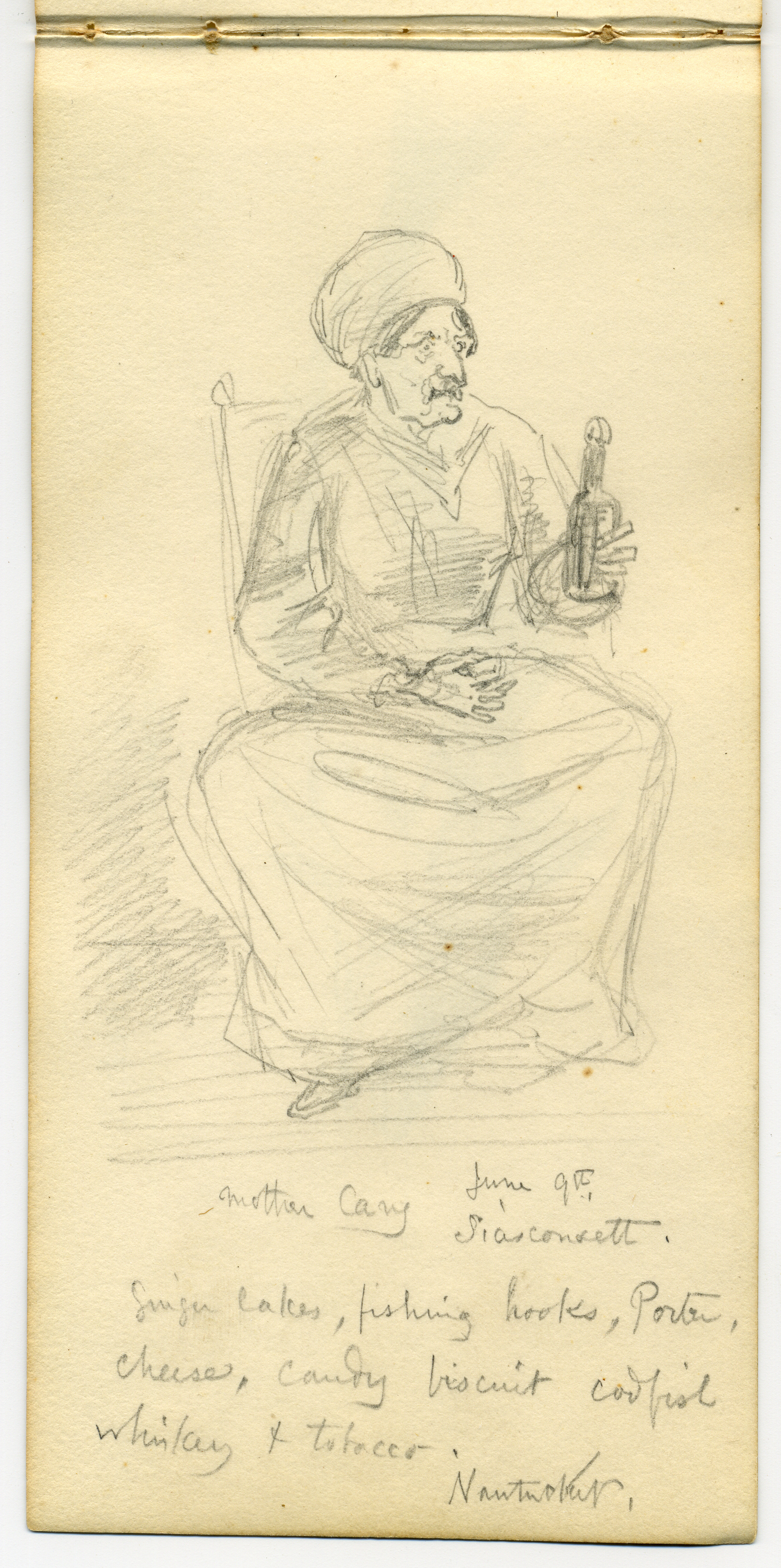 Mother Cary June 9th Siasconsett. Ginger cakes, fishing hooks, Porter cheese, candy biscuit, Codfish whiskey, & Tabacco Nantucket
